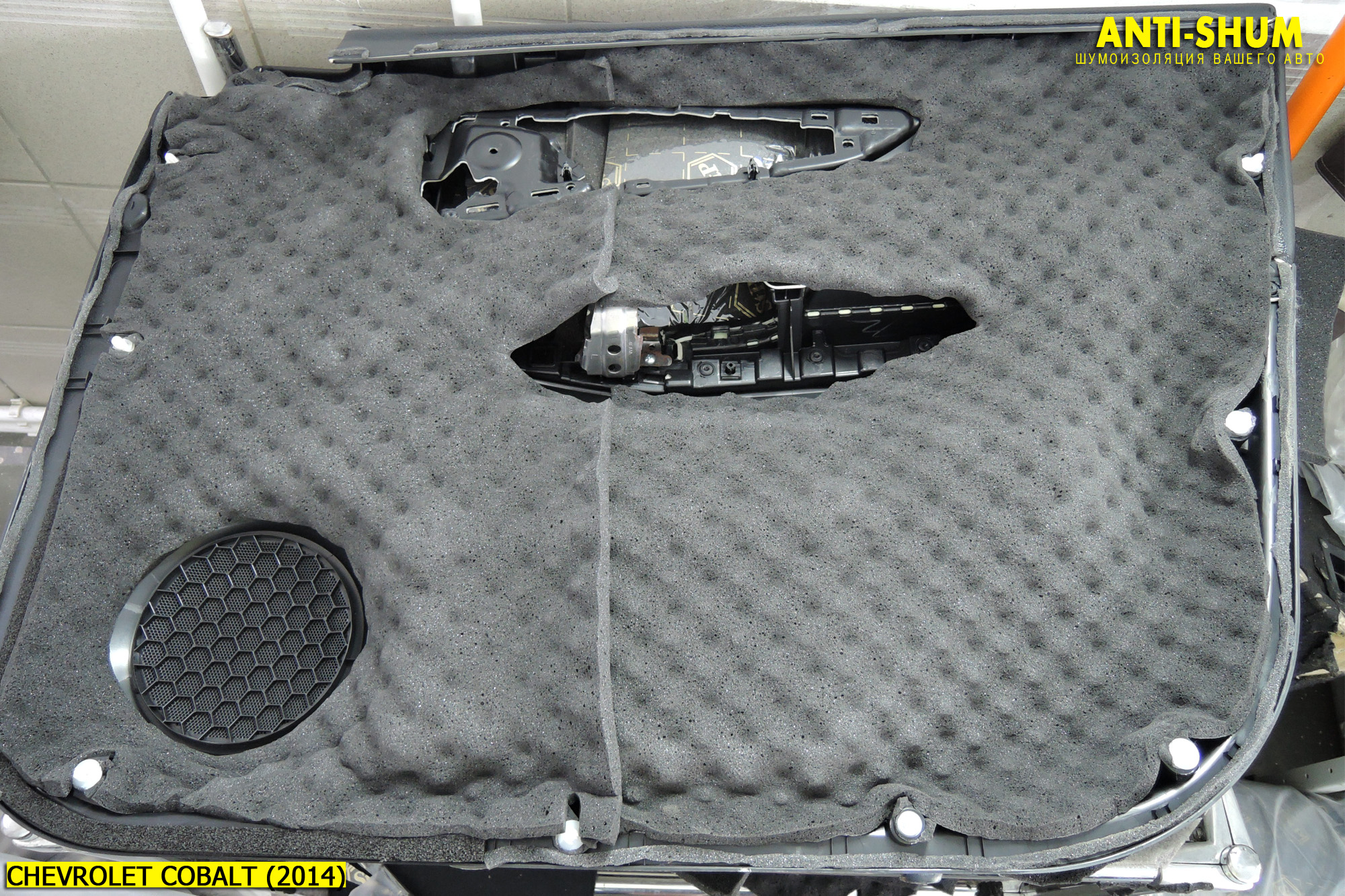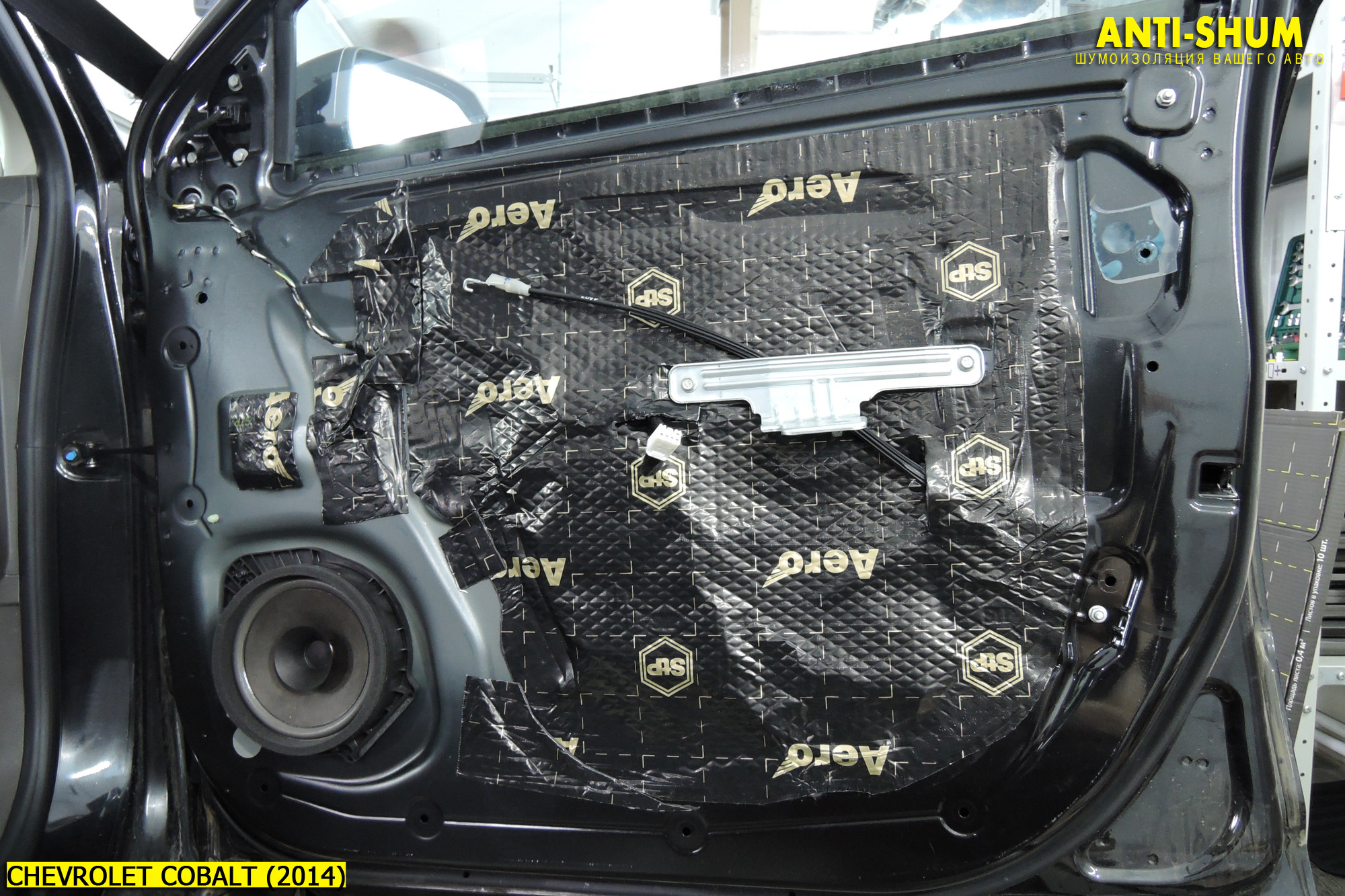 Затем мы закрываем все отверстия во внутреннем металле двери тем же виброизоляционным материалом СТП АЭРО (2 мм). Делается это прежде всего для паро- и влагоизоляции обшивки и салона авто от объема двери. Также это позволяет создать в двери Вашего Шевроле Кобальт подобие замкнутого объема, что положительно повлияет на звучание акустической системы!